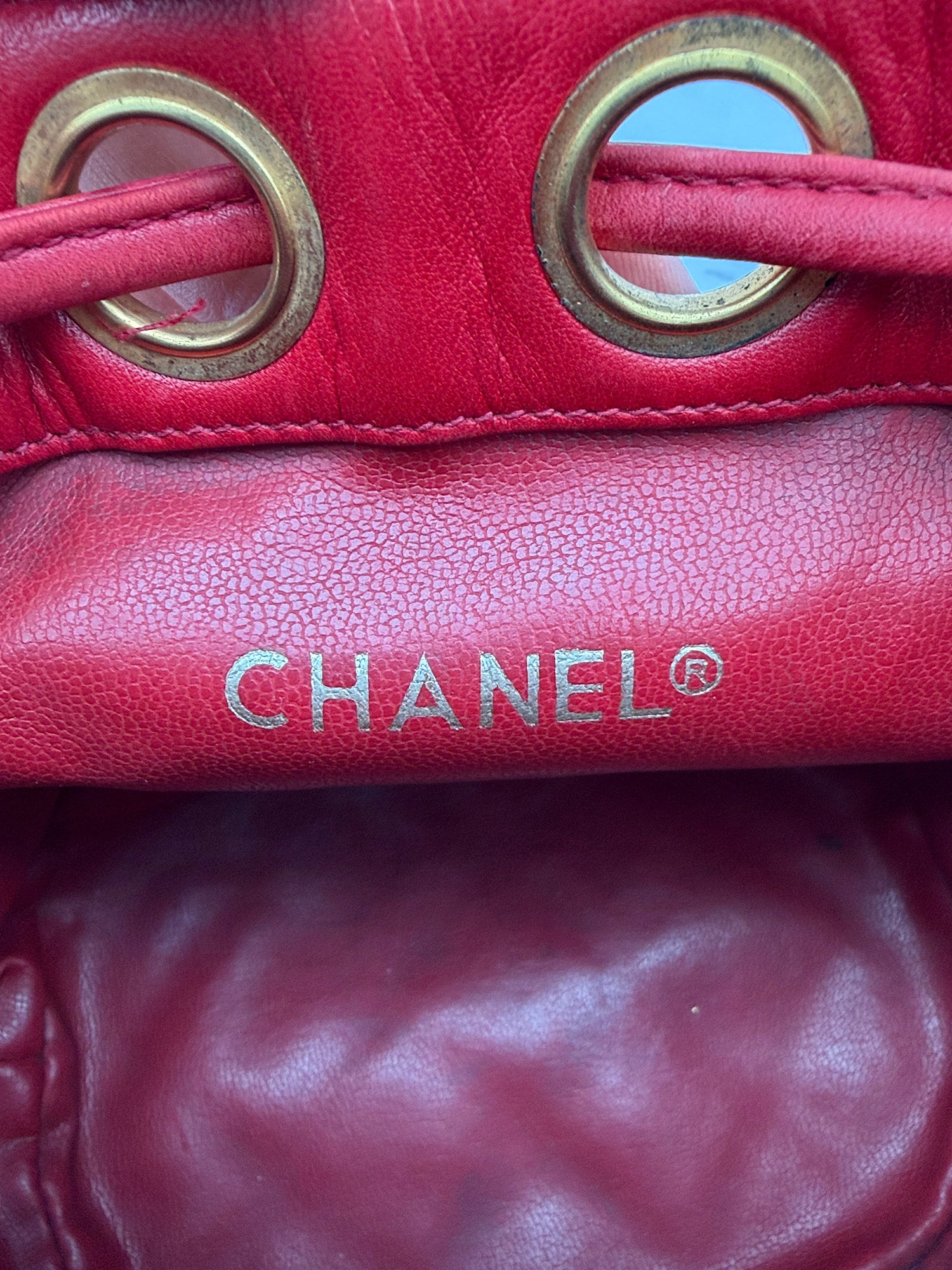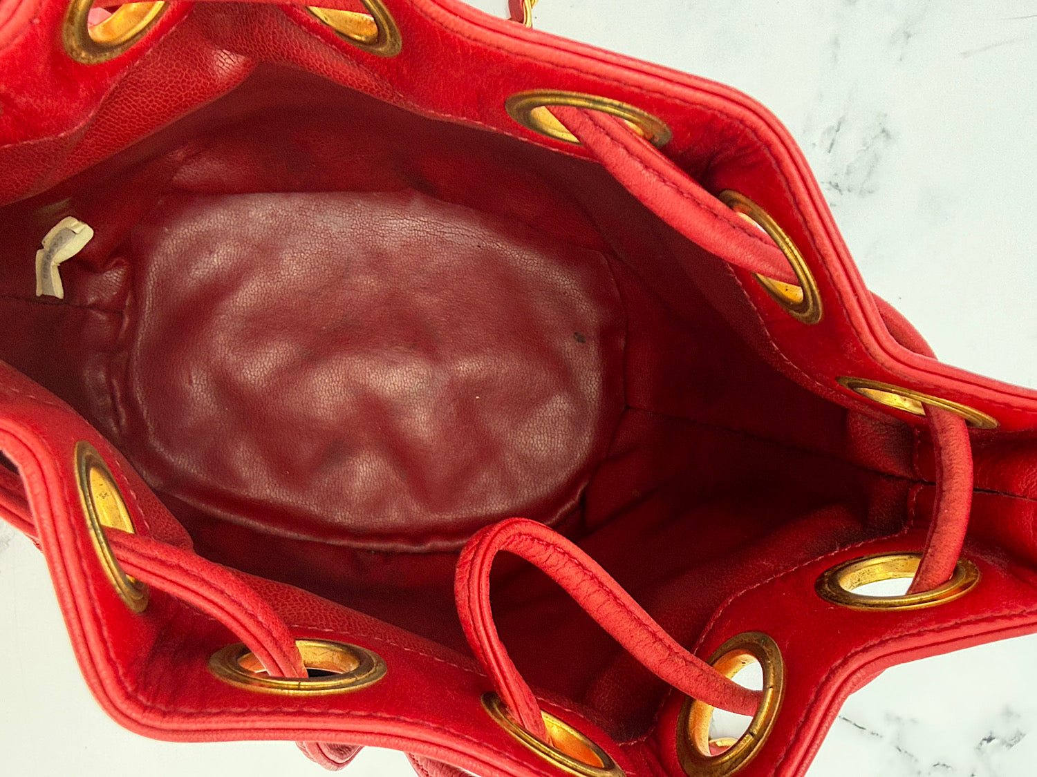 • Outside: very good conditions, light patina on the leather. Small penmark on the back (unnoticeable). Light wear/natural discoloration of the drawstring.