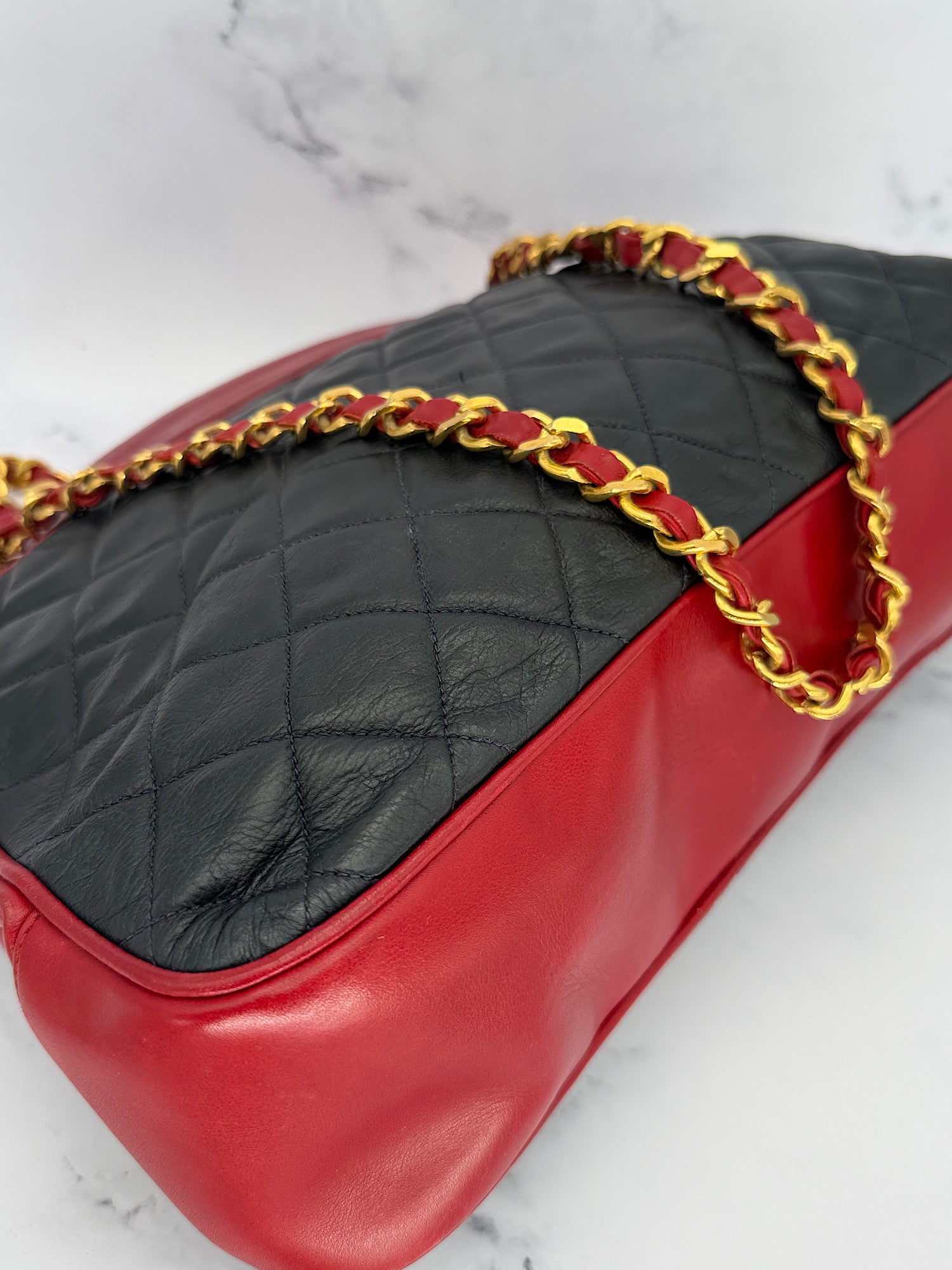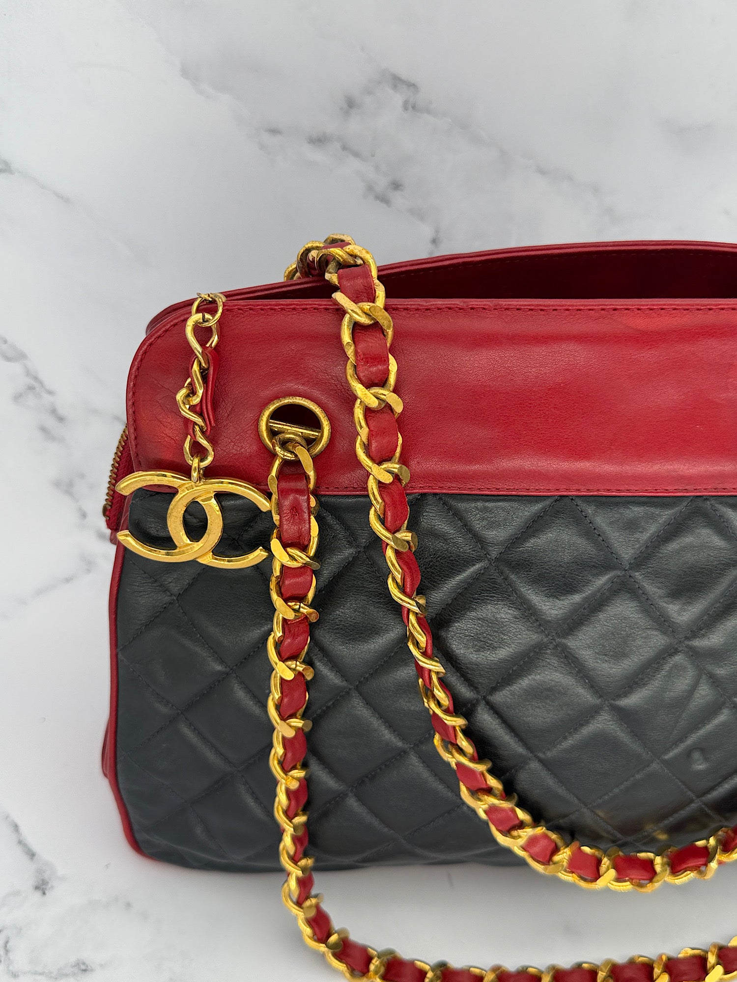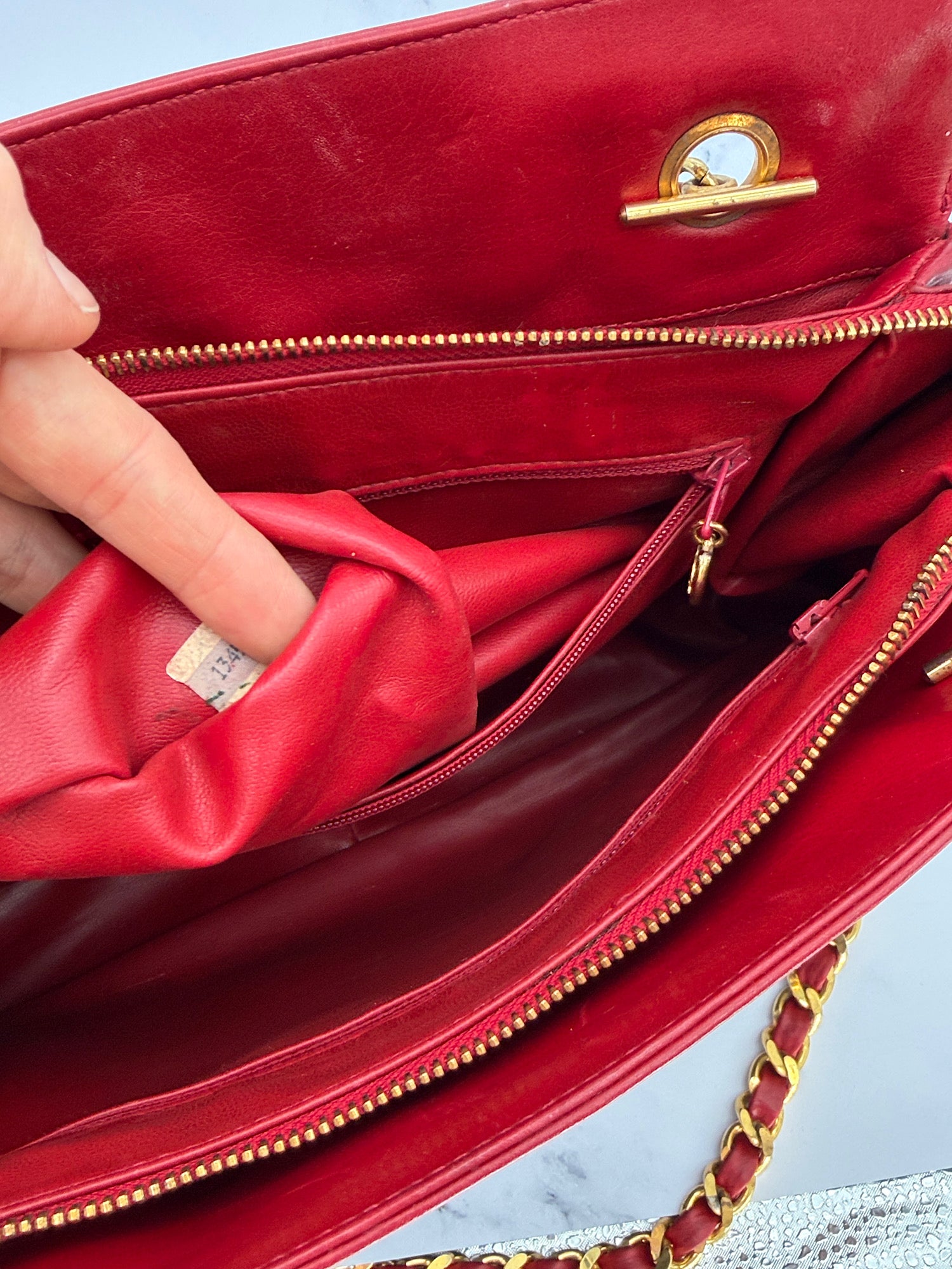 • Hardware: very golden and shiny. Some oxidation on the chains. Light powdery deterioration of the filling material (not visible, between external leather and inner lining). Glue marks close to the fastener.