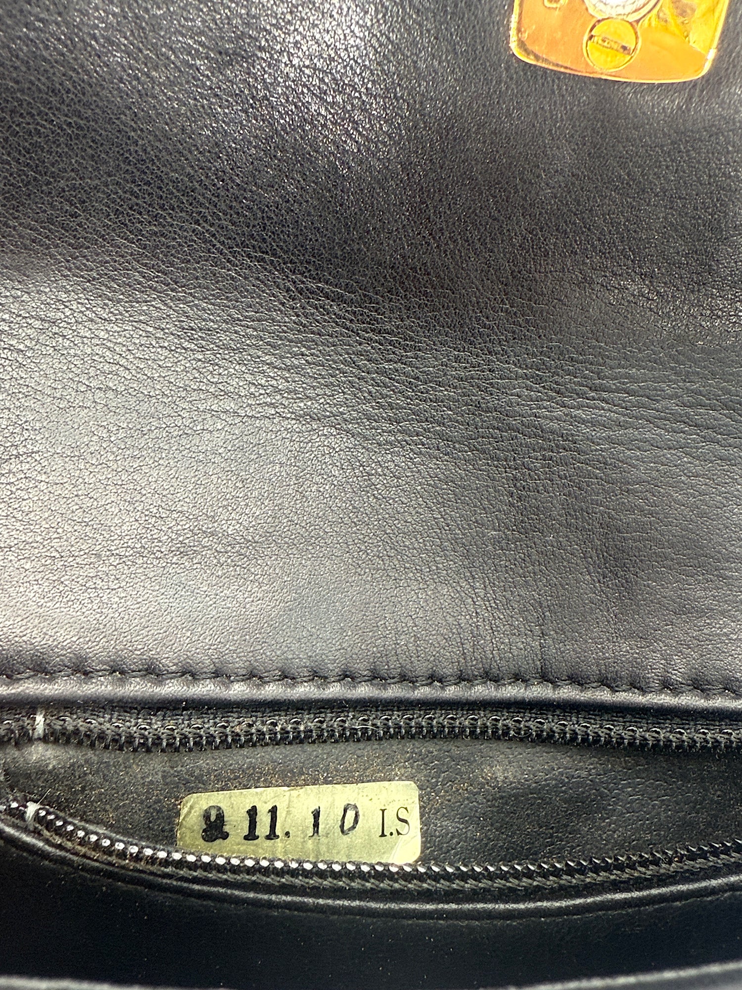 • Inside: the internal filler material (between the lining and outer leather) shows light deterioration; some powder may be visible inside the bag, not outside.