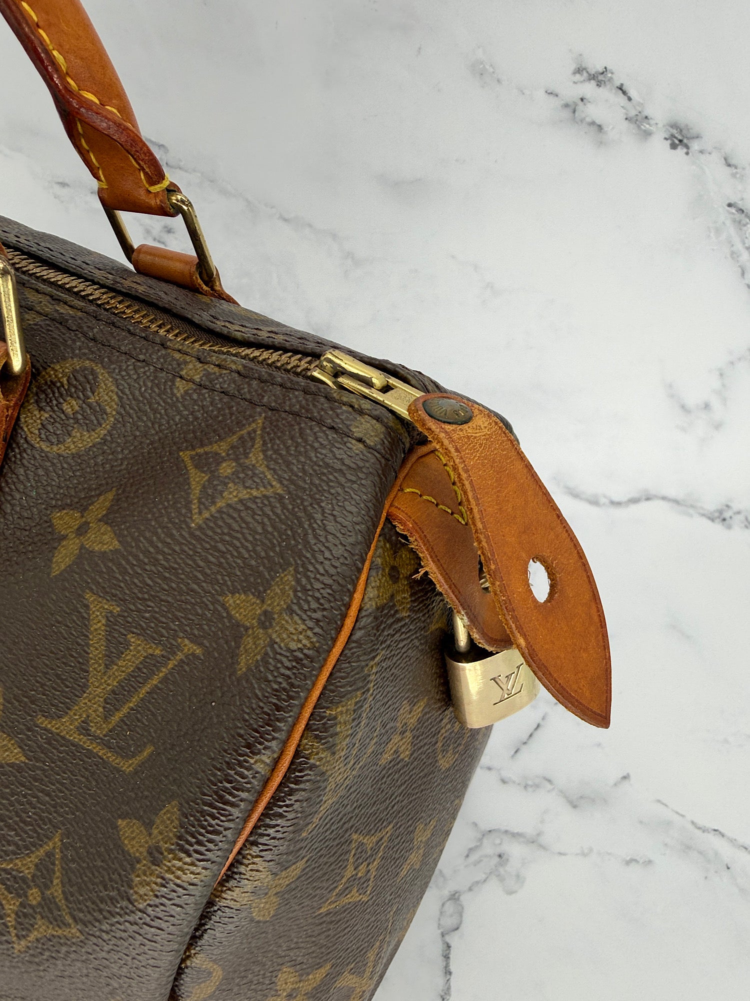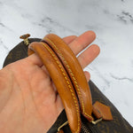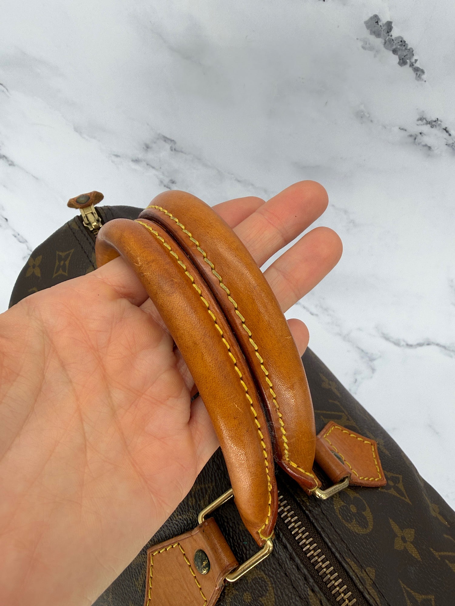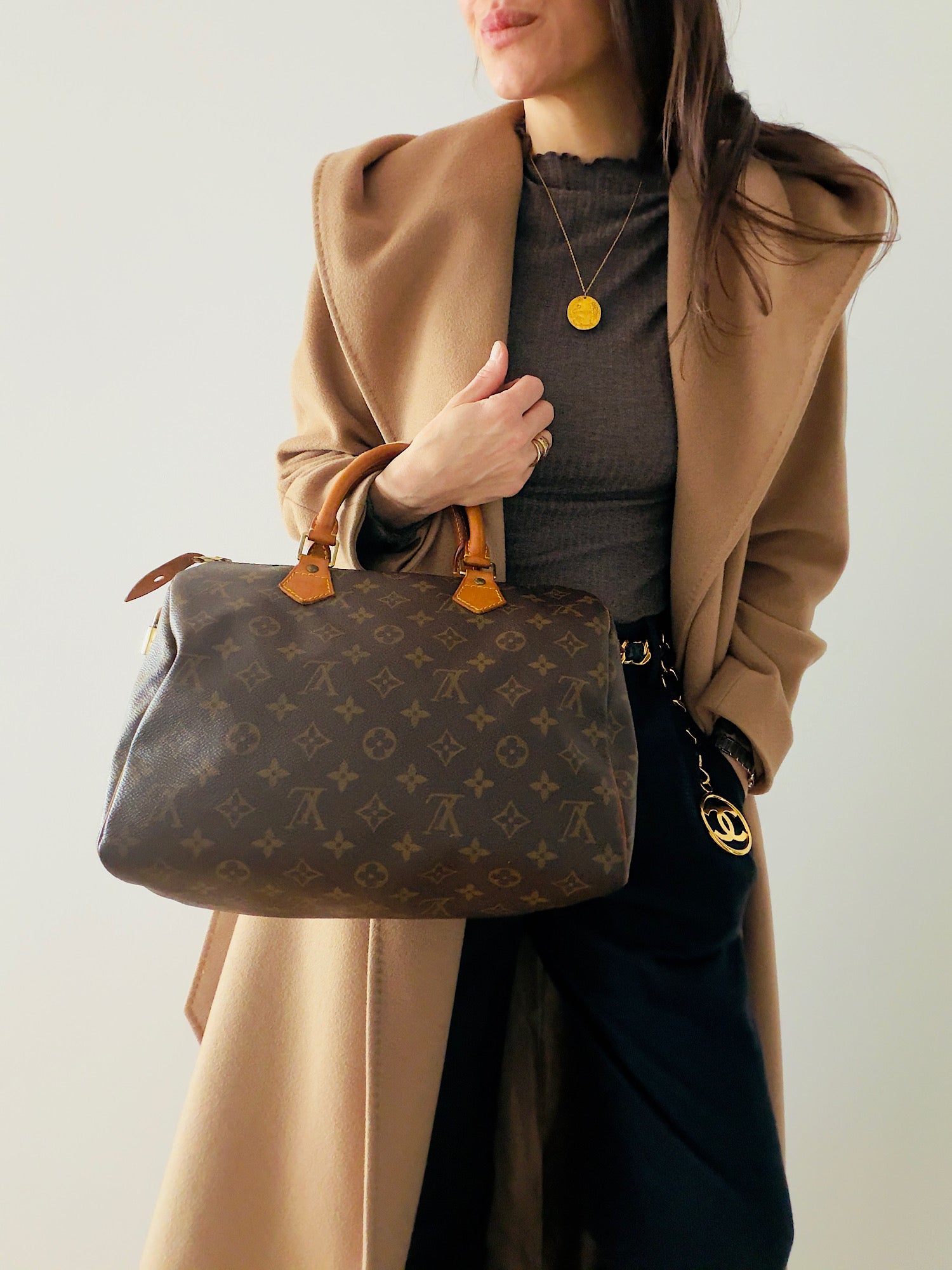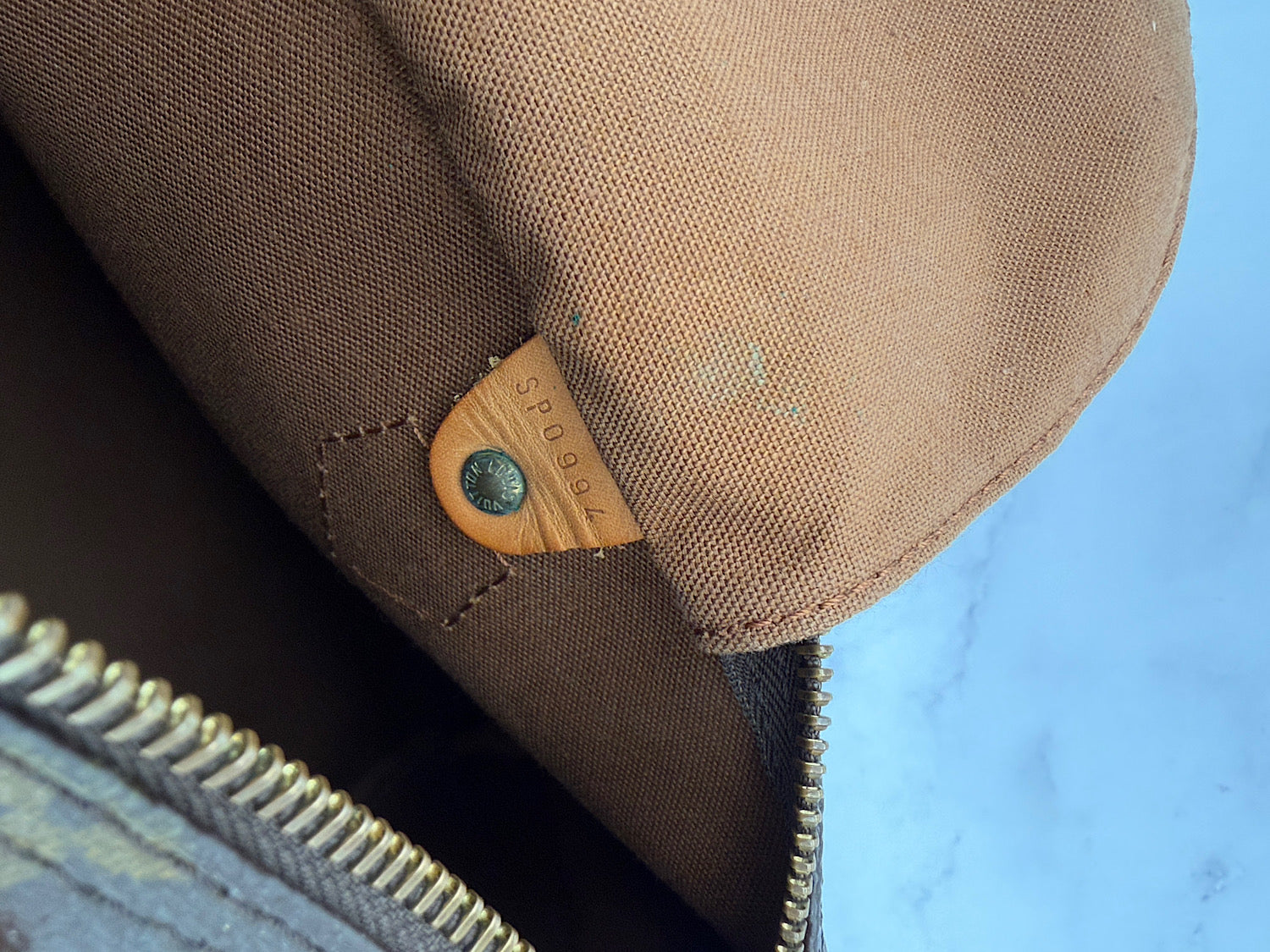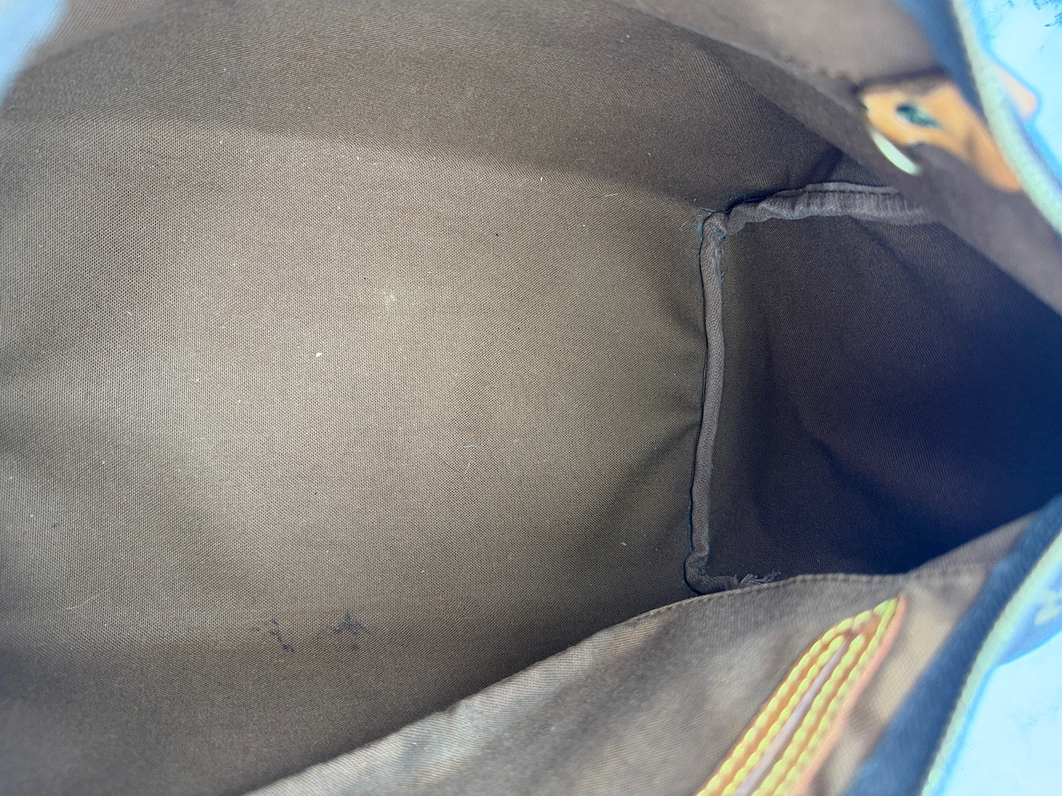 • Outside: very good conditions, the print on the canvas is clean and intact. The vacchetta took a nice honey color. Normal wear on the vacchetta corners/edges. Slight loss of shape due to storage.