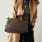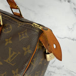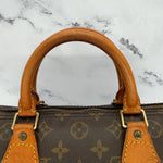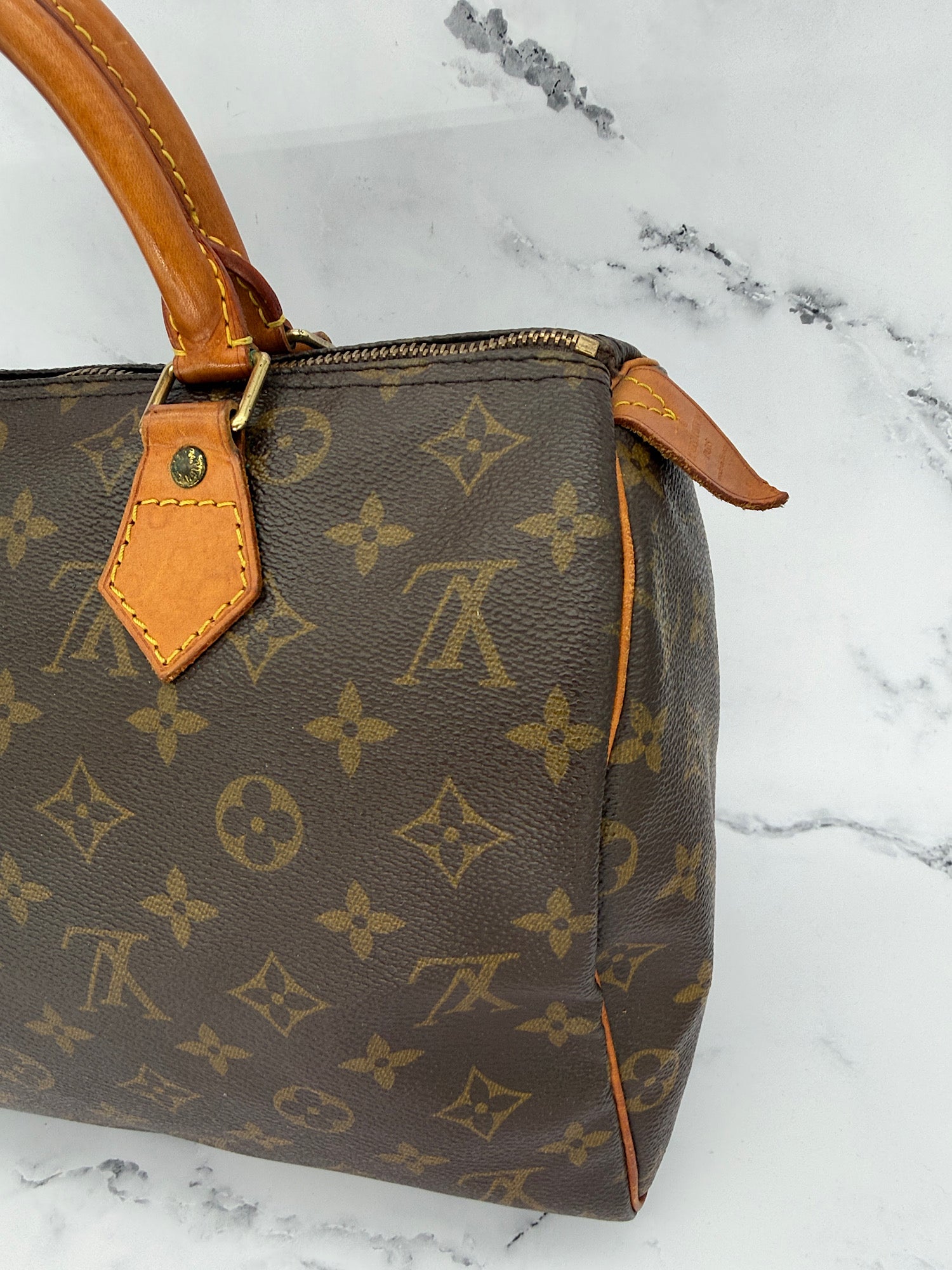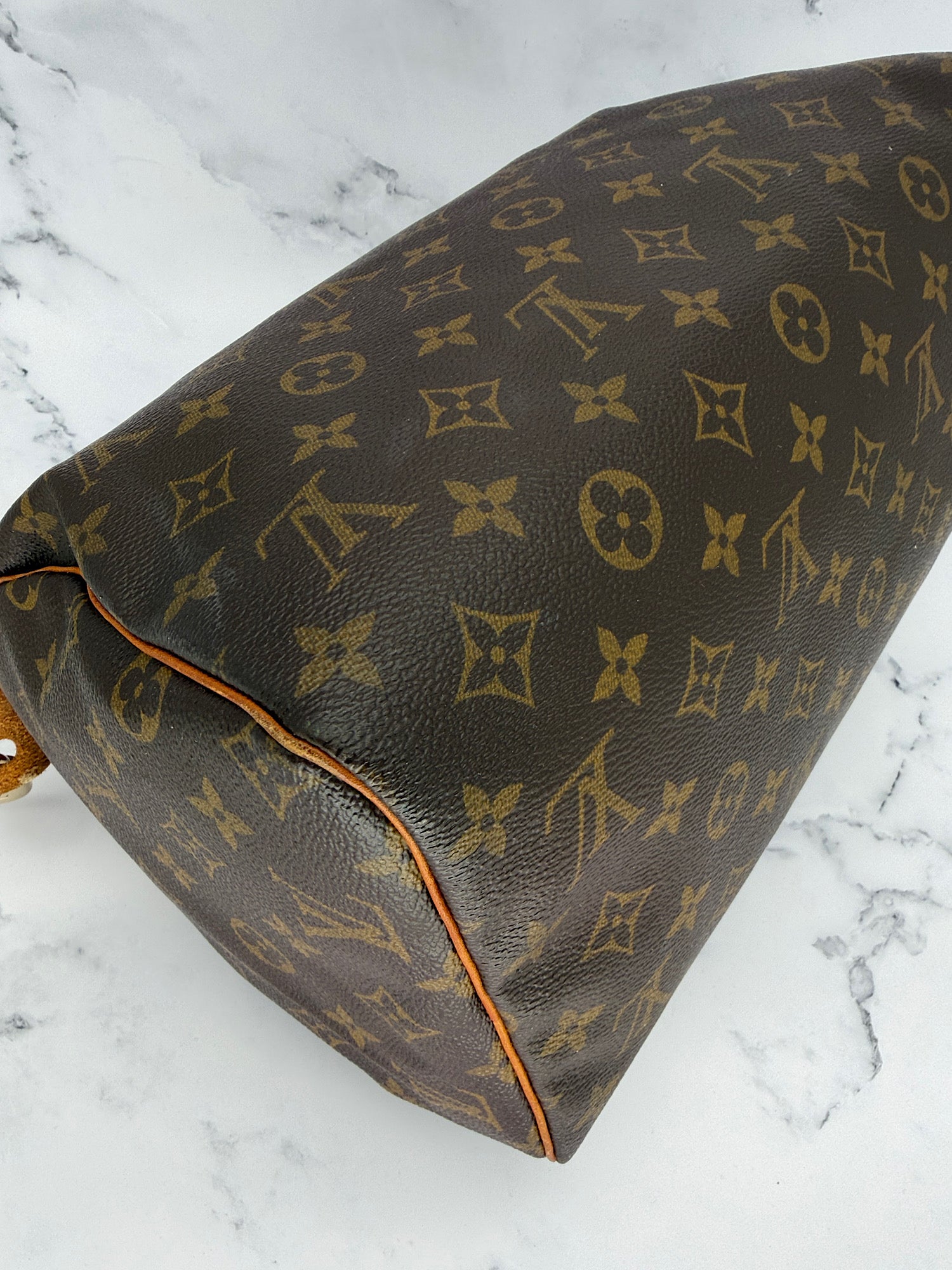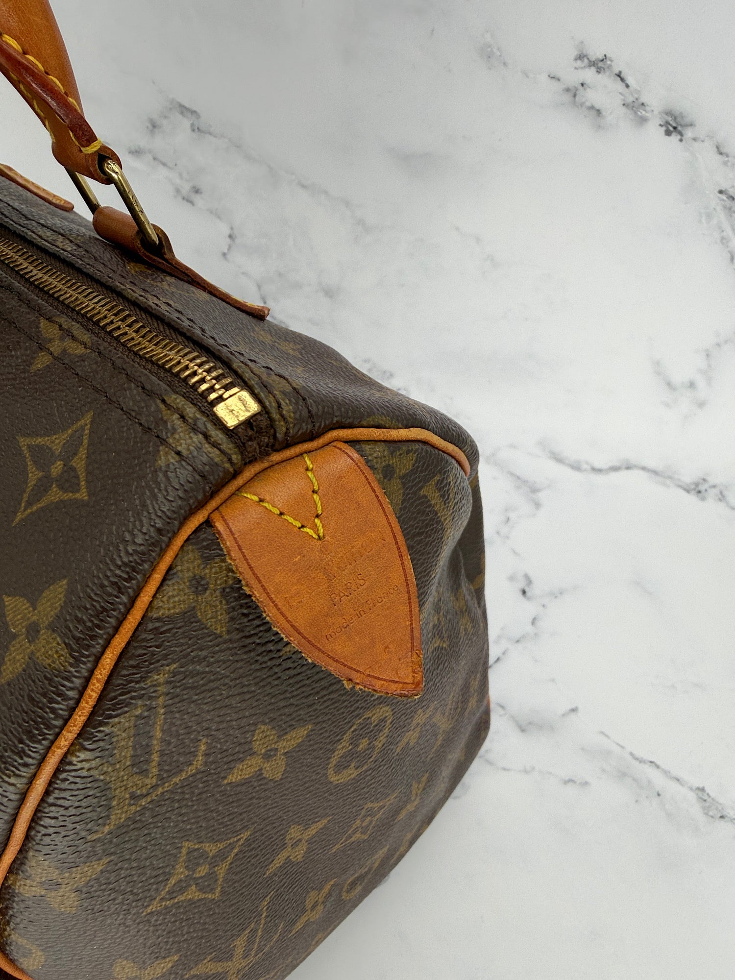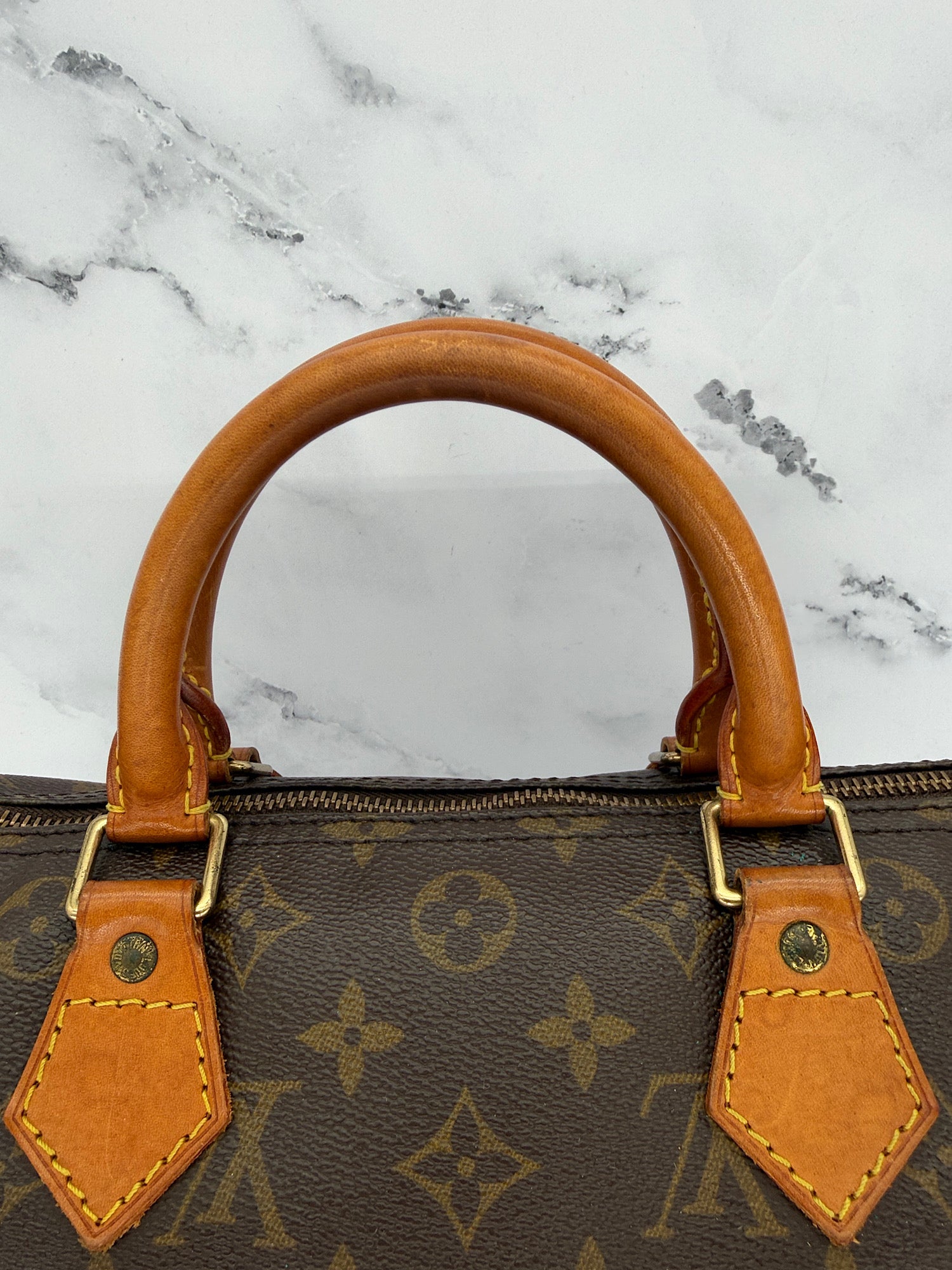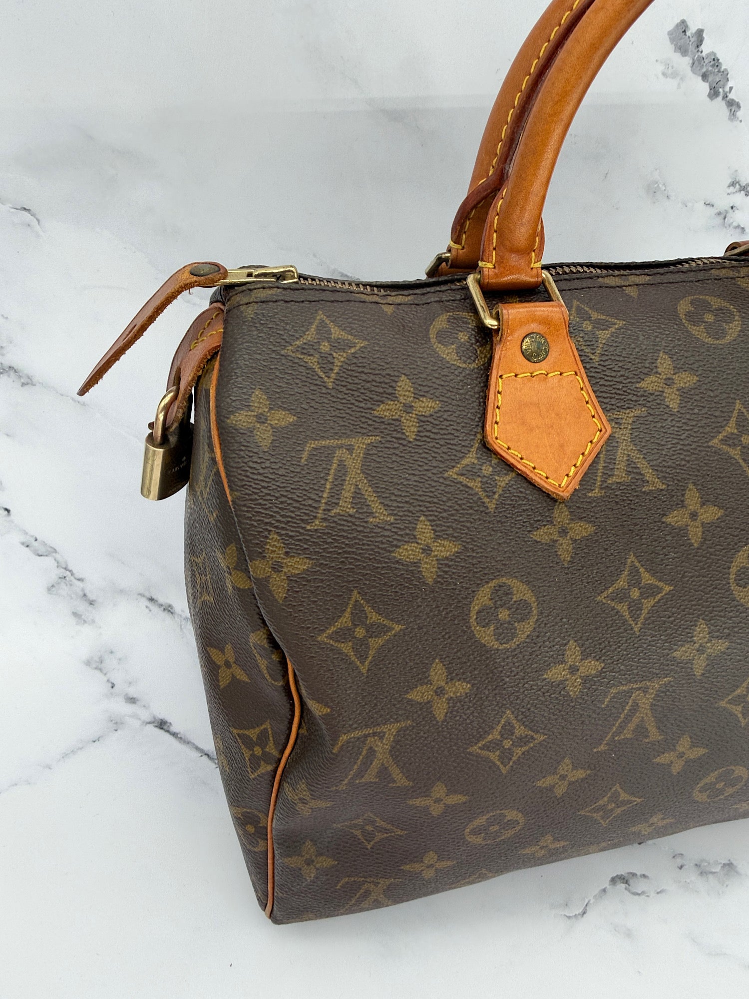 • Outside: very good conditions, the print on the canvas is clean and intact. The vacchetta took a nice honey color. Normal wear on the vacchetta corners/edges. Slight loss of shape due to storage.